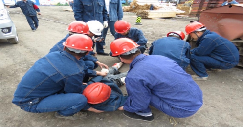 演練共分為參加演練人員集結(jié)、現(xiàn)場模擬人員受傷、采取止血包扎處理、現(xiàn)場管理人員發(fā)現(xiàn)事故后立即向指揮組匯報情況、指揮組接到通知后立即組織現(xiàn)場救援、各應(yīng)急小組迅速趕往事故地點、應(yīng)急救護(hù)組對傷者進(jìn)行簡單救護(hù)后將傷者送往醫(yī)院、事故處理組對事故進(jìn)行初步調(diào)查等過程。
